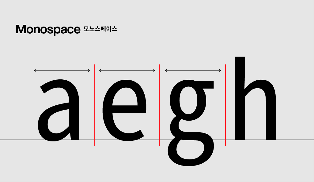 모노스페이스 폰트들은 여권, 코딩 프로그램 등, 글자들이 세로열에 맞춰 나열되어야 하는 특수 환경을 위해 제작되었습니다. 가독성을 고려하지 않는 폰트이지만, 모노스페이스 폰트들의 특유의 불균형이 일종의 트렌드로 자리 잡아 최근에는 웹디자인에서도 많이 활용되고 있는 것을 볼 수 있습니다.