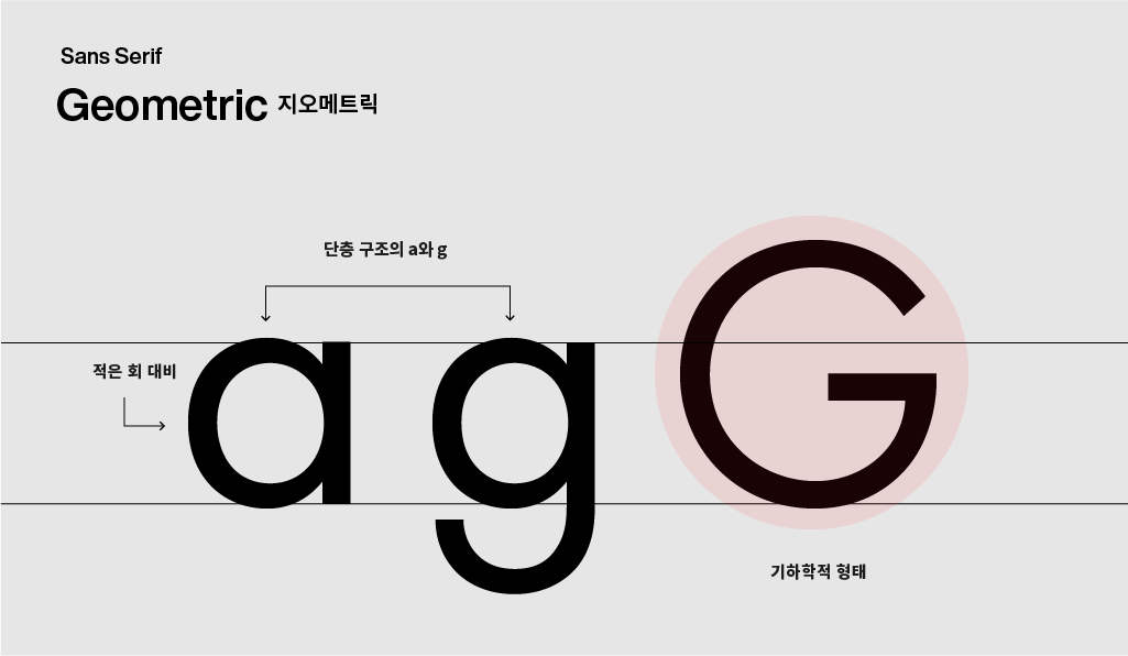 원, 삼각형, 사각형 등 기하학적 형태에 기반해 제작된 서체들을 일컫습니다. 기하학적인 디자인이 본문과 구분되어 제목과 단문에서 적용되기에 적합하지만, 공간 효율성과 가독성이 떨어져 본문에 잘 쓰이지는 않습니다.