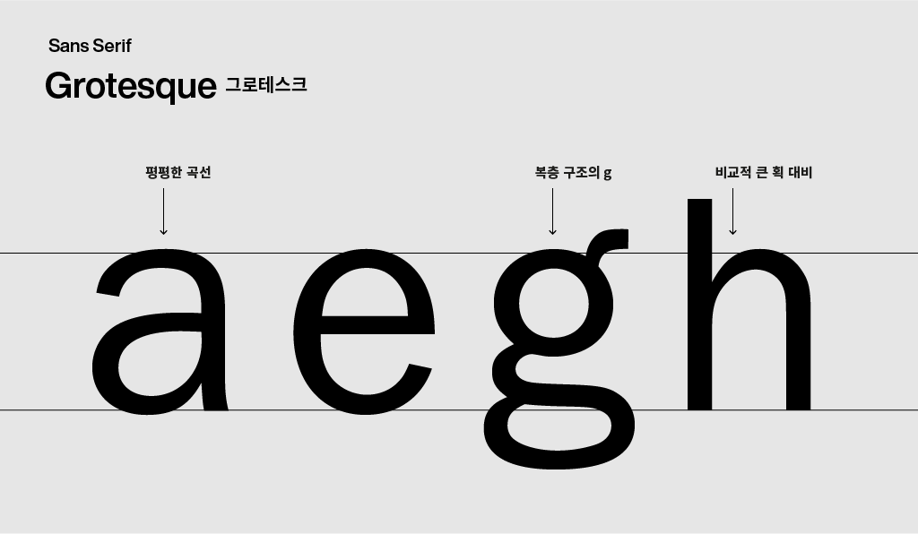 디돈체와 전통 간판에서 영향을 받아 디자인된 그로테스크 서체들은, 단단하고 굵은 디자인으로 제목이나 광고에 많이 활용되었습니다.