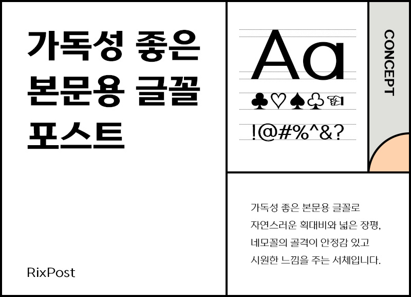 Rix포스트는 가독성 좋은 본문용 글꼴입니다. 대칭을 주로 이루는 기존의 고딕들과 달리 조금은 사람 냄새가 나는 자연스러움을 주는 서체라고 할 수 있죠. 기본적으로 책, 포스터, 팸플릿 등 텍스트가 많이 필요한 곳에 잘 어울리며, 다양한 웹, 그래픽 디자인 콘텐츠에도 유용하게 쓰일 것으로 보입니다.