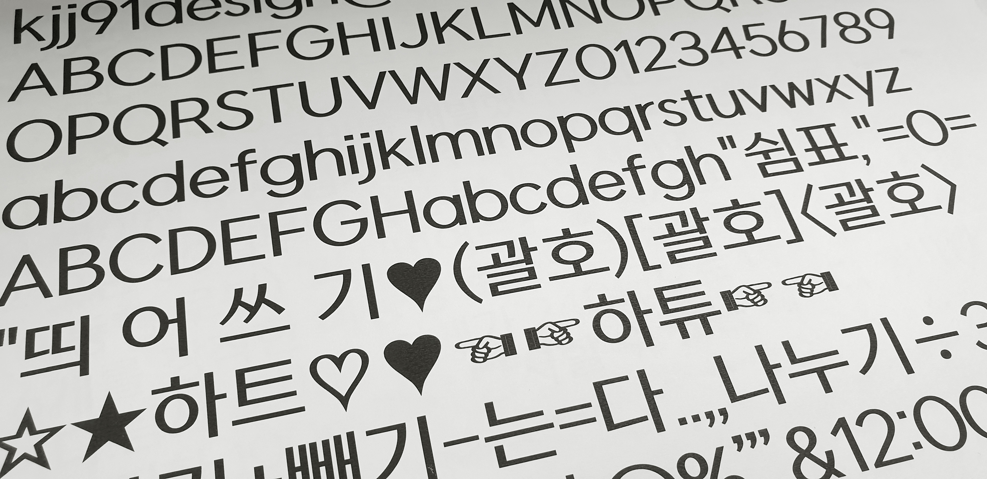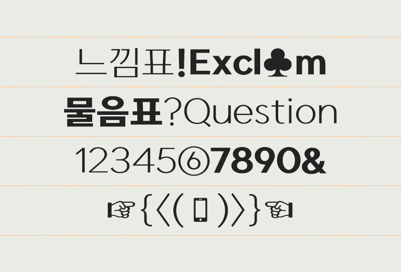 개인적으로 영어로 쓴 글씨가 특히나 맘에 드는 폰트입니다. (모던하고 세련된 느낌이 쓸수록 너무 예쁘답니다!) 특수문자들도 서체의 특징을 살려서 획대비가 들어가 있고, 전화기(☎) 모양이 저렇게 스마트폰 모양으로 표현되는 깜찍함까지. 아주 트렌디하죠.