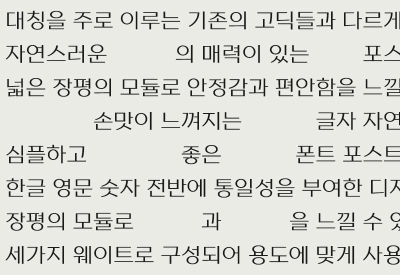 어딘가(?) 알게 모르게(?) 은근슬쩍(?) 사람 냄새나는 고딕이라고 할까요? 차분한 사람 같아 보이기도 해요. 대칭을 주로 이루는 고딕들과 다르게, 대칭을 이루지 않는 획들을 조합해 자연스러운 느낌을 주는 것이 매력이에요!
