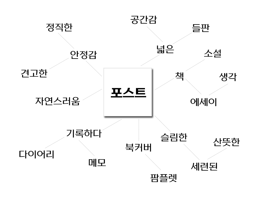 폰트를 보고, 또 직접 써보고 떠오르는 단어들을 마인드맵으로 그려봅니다. 여러 디자이너들이 머리를 모아 단어들을 던지고, 컨셉을 잡아갑니다. Rix포스트 폰트는 견고하지만 자연스럽고, 담백하면서 시원한 감정을 이끌어내 주었습니다.