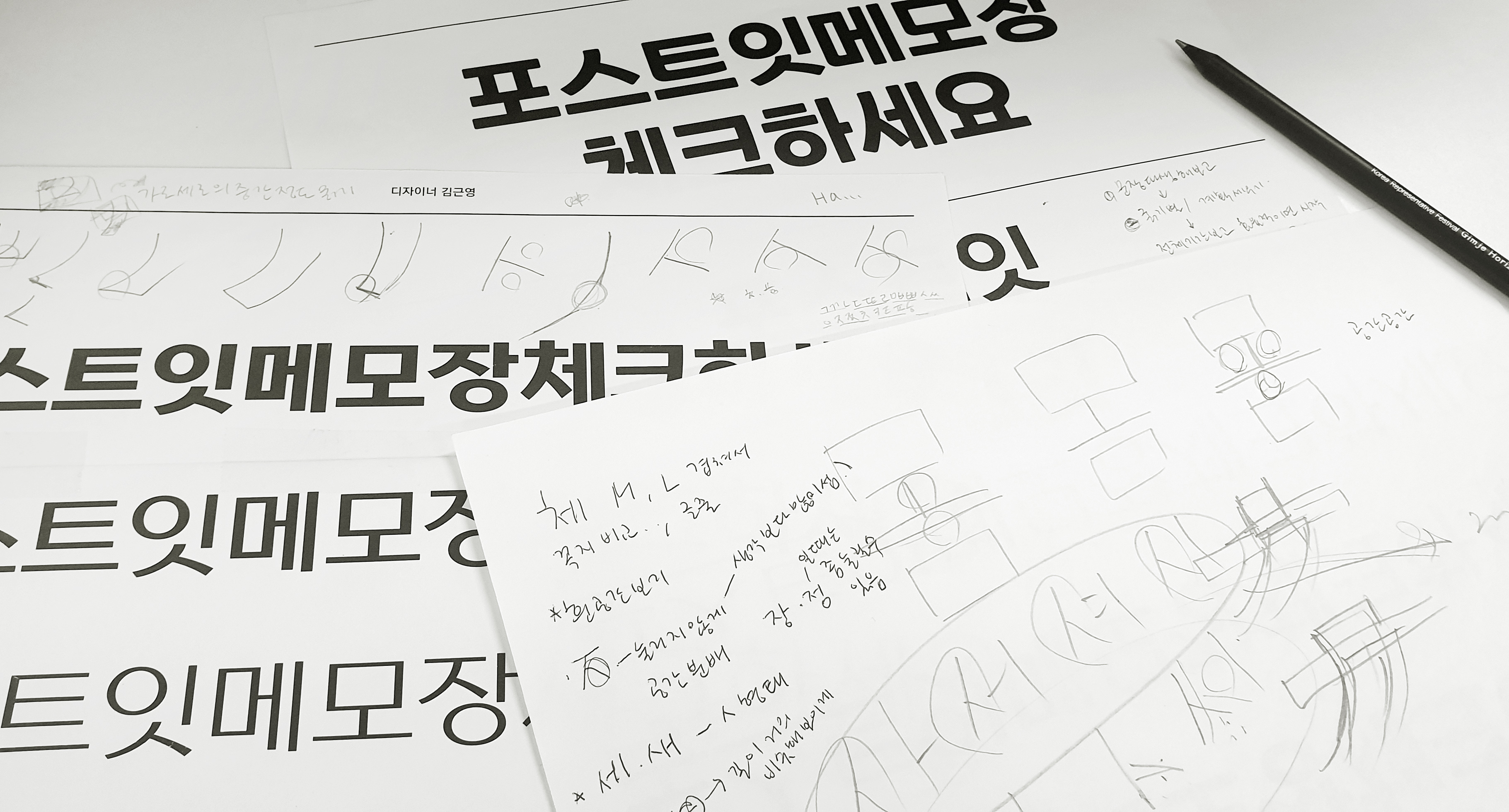 그래서 본문에도 쓰일 수 있는 고딕 폰트로 정했고 기존의 고딕들과 차별화되도록 손맛을 담아보려고 했어요! 질문에 언급해 주신 것처럼 '포스트'라는 단어에는 다양한 의미들이 있는데요, 우편물, 편지, 게시글(소셜 네트워크 등에 올리는) 등등. 이런 의미처럼 어딘가에 글을 게시하다, 쓰다 같은 느낌이 폰트와 잘 어울린다고 느껴졌답니당!
