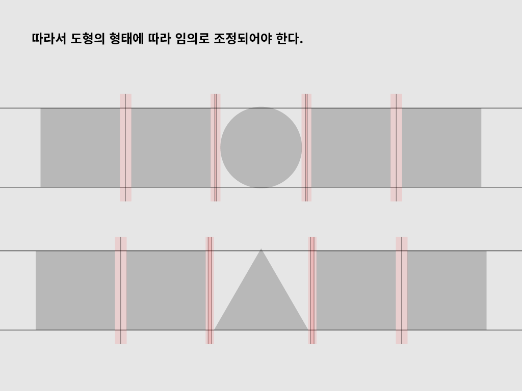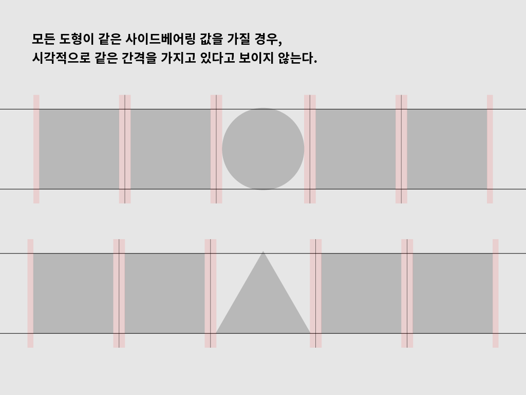 맨 처음 이미지에서 언급한 원형과 사각형의 여백 때문에 모든 도형이 같은 간격으로 위치하고 있음에도 불구하고 더 많은 공간을 차지하는 것처럼 보입니다. 일종의 착시 현상이죠.