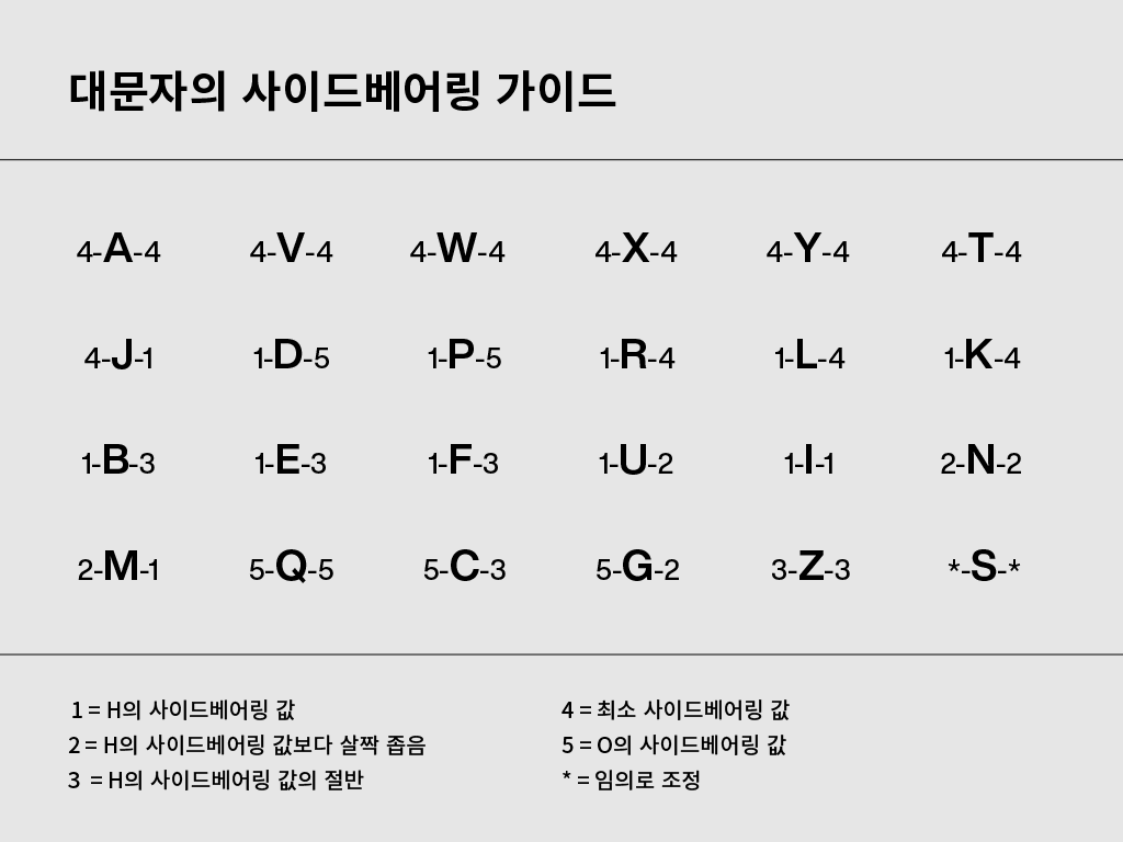 이론을 배웠으니 이제 실제 알파벳들이 어떤 기준으로 간격을 정하는지 알아볼 차례입니다. 이번 글에서는 영문의 대문자 26자와, 소문자 26자의 간격 조정 방법을 설명할 예정입니다. 대문자부터 한번 볼까요?