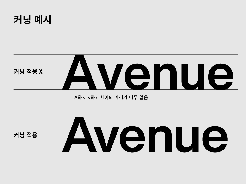 위의 Avenue라는 단어에서 A와 v, 그리고 e가 너무 떨어져 있는 것이 보이시나요? 아무리 사이드베어링 값을 적절하게 조정해도 위와 같이 서로를 거부하는 글자 조합들이 있습니다. 커닝을 적용하면 아래 단어처럼 단정하게 간격을 조정할 수 있습니다.