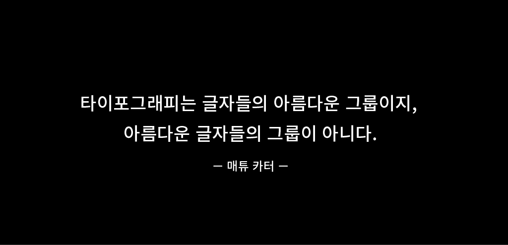 위의 인용구는 Georgia, Big Calson, Verdana 등의 유명 서체들을 제작한 영국의 대표적인 타입 디자이너, 매튜 카터가 한 말입니다. 아무리 한 글자, 한 글자가 아름답게 디자인되더라도 그 글자들이 모였을 때 아름답지 않다면 의미가 없다는 말이죠.