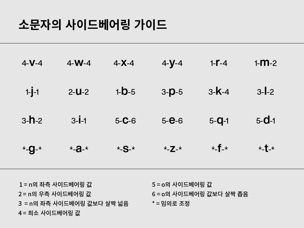 나머지는 대문자와 같이 조정하시면 됩니다. (a, g, s, z, f, t와 같은 글자들이 임의로 조정되어야 하는 이유는 폰트의 스타일에 따라 이 글자들의 모양이 너무 달라지기 때문입니다.)