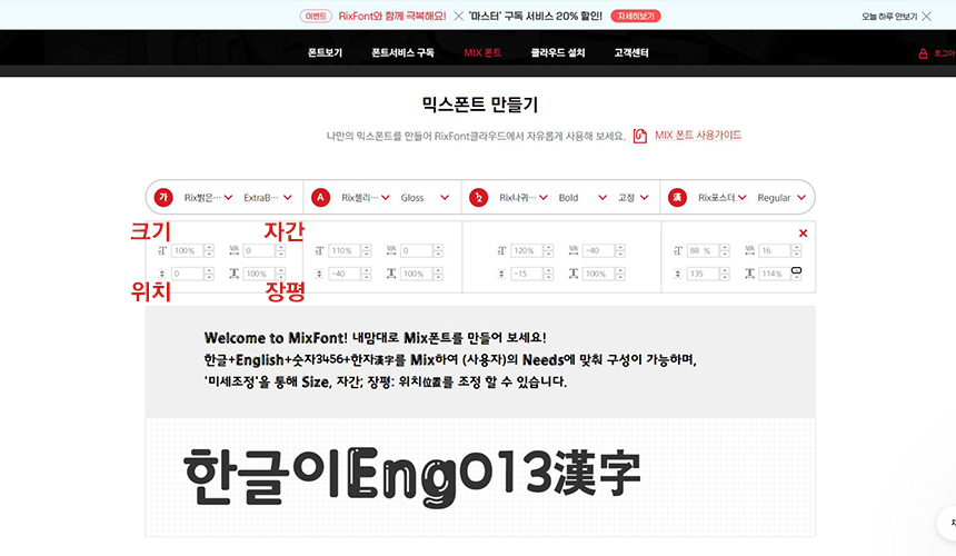 각각의 다른 폰트들을 조합하는 것이기 때문에 크기나 위치가 뒤죽박죽일 수 있는데 굉장히 세세한 조정을 할 수 있답니다. 보통 한글보다 크기가 작은 영어와 숫자는 크기를 키워주고 위치, 자간을 조절해서 한글과 잘 어우러지게 맞춰주었고요, 또 한문도 'Rix포스터' 폰트를 선택해 숫자와 어우러지게 폰트미세조정을 해주었습니다.
