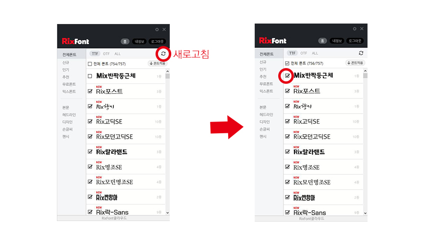 이제 릭스폰트클라우드를 열어 사용해 볼까요? 내가 만든, 또는 공유된 믹스폰트는 클라우드의 전체 폰트 리스트에서 확인할 수 있습니다. 전체 폰트에서 보이지 않는다면 꼭 새로고침을 클릭해주세요. 폰트의 네모 박스를 체크해 활성화하거나 ↓폰트적용 버튼을 클릭해 활성화할 수 있습니다.