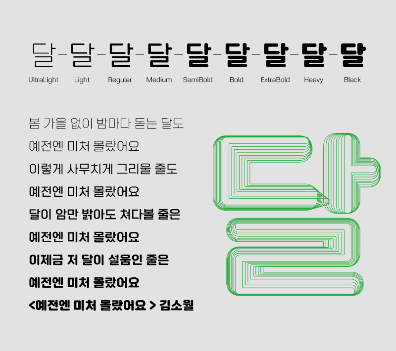 가장 얇은 UltraLight부터 가장 두꺼운 Black까지 세부화된 웨이트에 따라 적당한 굴림과 공간 구성을 고민했습니다.