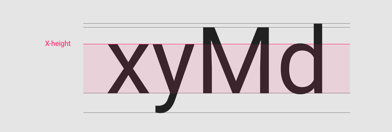x-height는 소문자 x를 기준으로 하는 기준선입니다. 크기가 작은 텍스트일 경우 이 x-height가 높아질수록 글자의 갇힌 공간(counter)이 넓어지게 되어 글자를 인식하는 속도가 빨라진다는 연구 결과가 있습니다.