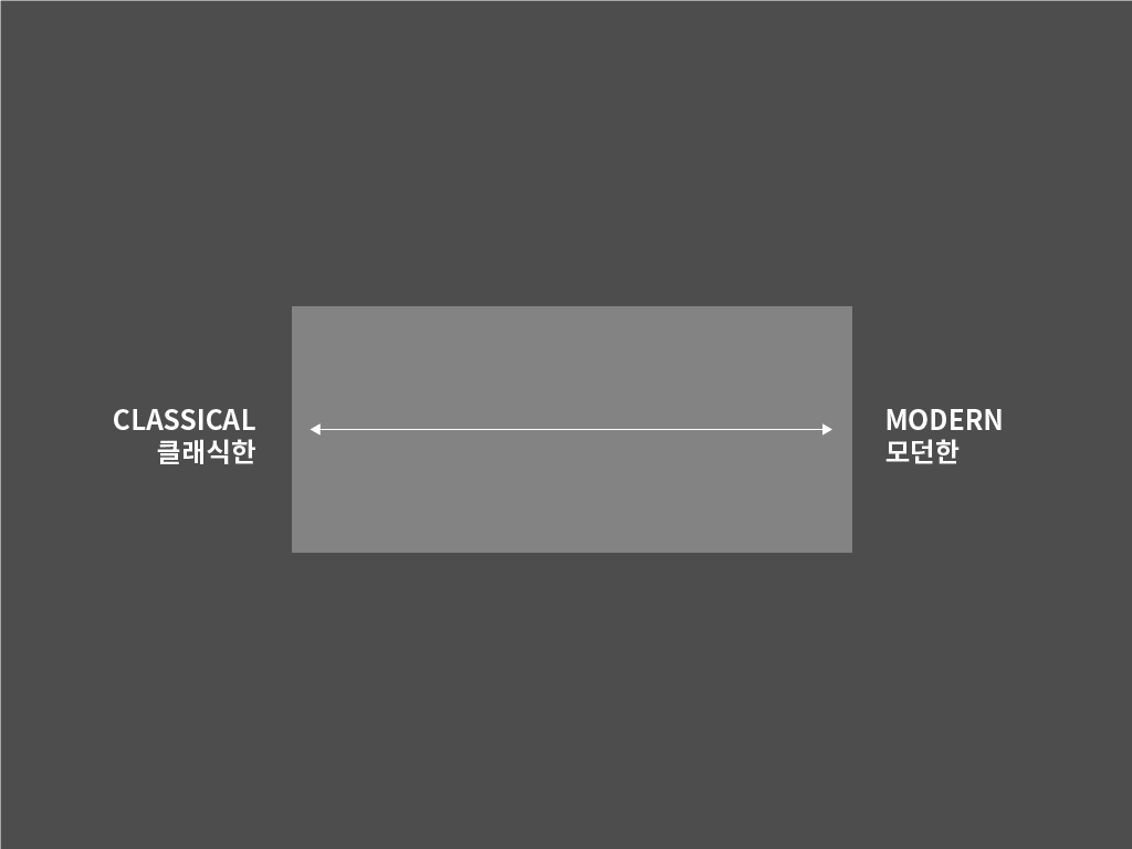 첫 번째 기준이 될 X축은 클래식함 vs. 모던함입니다. 영문 타이포그래피는 세리프(Serif) 폰트와 산세리프(San-serif) 폰트로 분류되는데요, 초기 필기체에 기반에 디자인된 세리프체는 잉크 자국을 그대로 살린 세리프 장식으로 클래식함을 표현하기에 적합하며, 모더니즘과 함께 태어난 산세리프 폰트들은 비교적 모던한 느낌을 줄 수 있습니다. 하지만 이 기준 하나로 폰트를 고르기에는 아직 너무 광범위합니다.