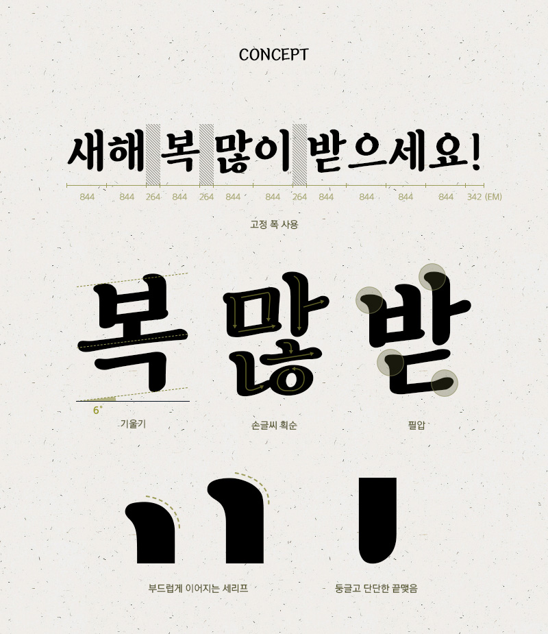 손글씨 획순을 따른 글자는 옛 명조체의 느낌이 많이 납니다. 강약 조절로 필압이 느껴지게 하고 기울기를 주어 실제로 손으로 쓴 것과 같은 느낌을 주었습니다. 또한 부드러운 세리프와 둥글고 단단한 끝맺음으로 세련미가 느껴지도록 했습니다.