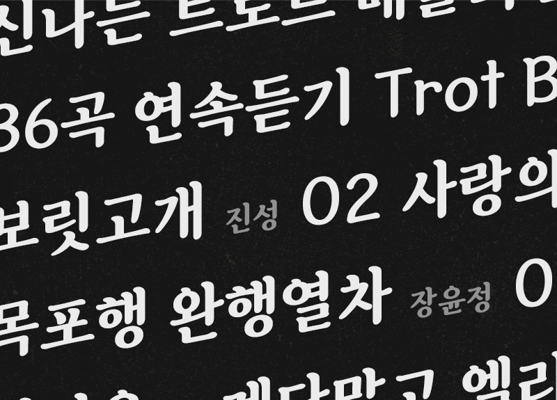 평소에 자사 서체를 제작할 때에는 타깃과 시장성보다는 재밌고 특이하고 폰트 시장에서 보기 드문 시안을 많이 만드는 편인데 이번에는 시장성과 요즘 트렌드를 알아보려고 했어요. 폰트가 많이 사용되는 TV 프로그램들에서 시청률이 높은 대부분의 프로그램이 트로트 관련 방송들이었어요. 그래서 트로트 프로그램 자막들에서 많이 사용될 수 있도록 포커싱 해서 제작된 서체입니다. 마침 오픈도 1월에 하다 보니 신년 맞이와도 어울리는 것 같아 좋은 것 같아요!