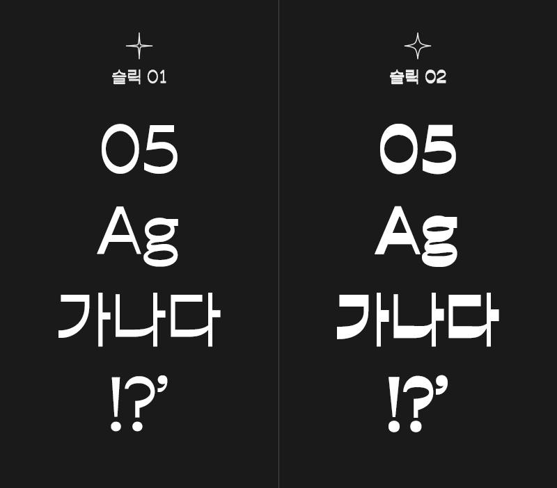 슬릭은 총 두 가지 굵기를 제공합니다. 슬릭 01은 조금 더 보편적인 획 굵기를 가지고 있어 본문에도 편안하게 활용하기 좋게 제작되었습니다. 슬릭 02는 획 굵기의 대비를 좀 더 부각하여 눈에 띄는 헤드라인용으로 적합하며, 개성이 돋보이는 매력적인 디자인 요소들을 느낄 수 있습니다.