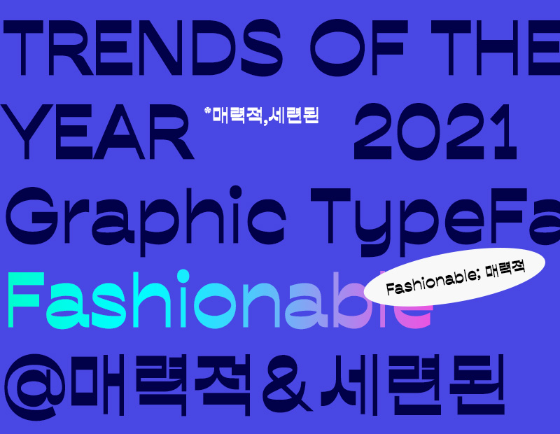 글자 자체에서 트렌디함이 굉장히 돋보이도록 설계되었습니다. 명료하게 떨어지는 자소의 골격이 깔끔한 인상을 주면서 획의 두께가 일반적이지 않아 그래픽적이고 개성 있게 보입니다. 비교적 넓고 네모 반듯한 골격이 뉴트로적인 느낌도 살짝 풍깁니다.