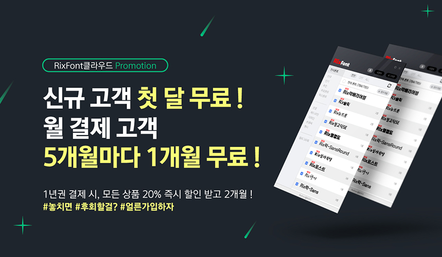 5개월마다 찾아오는 한 달 무료 결제 서비스. 1년에 두 번 결제는 누가? 릭스폰트에서 대신해드립니다. 신규 회원은 첫 달 무료부터 5개월 후 한 달 무료까지 묻고 따블로 가!! 남는 게 있나 싶다고요?(그런 질문 하지 않기로 해요^^ㅎ) 모두가 힘든 시기니까 함께 이겨내 보아요🤗