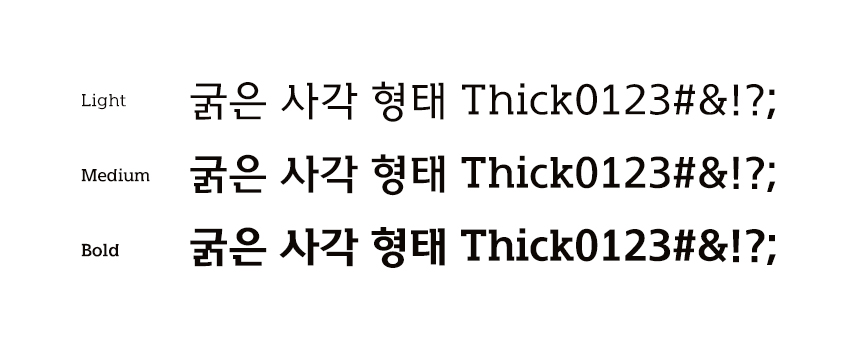 획 두께의 대비 차이가 없이 일정한 굵기로 제작되었고, 기존의 슬랩 세리프들과는 다르게 가변폭을 사용하여 보기에 편안하도록 설계했습니다. 굵기에 따라 Light, Medium, Bold 3가지의 웨이트로 파생했습니다.