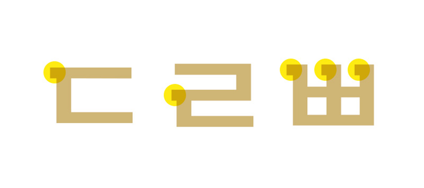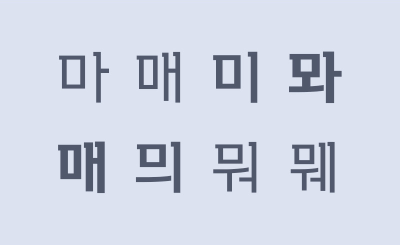 획 순서를 고려해 적용한 세리프는, 다소 둔탁해 보일 수 있는 각이 진 형태를 보완하여 쉐입이 보다 자연스러워 보일 수 있도록 디자인했습니다. 직각 세리프가 단단한 힘을 실어 주지만 과하지 않게 디자인되어 전체적으로 단정한 느낌을 줍니다.