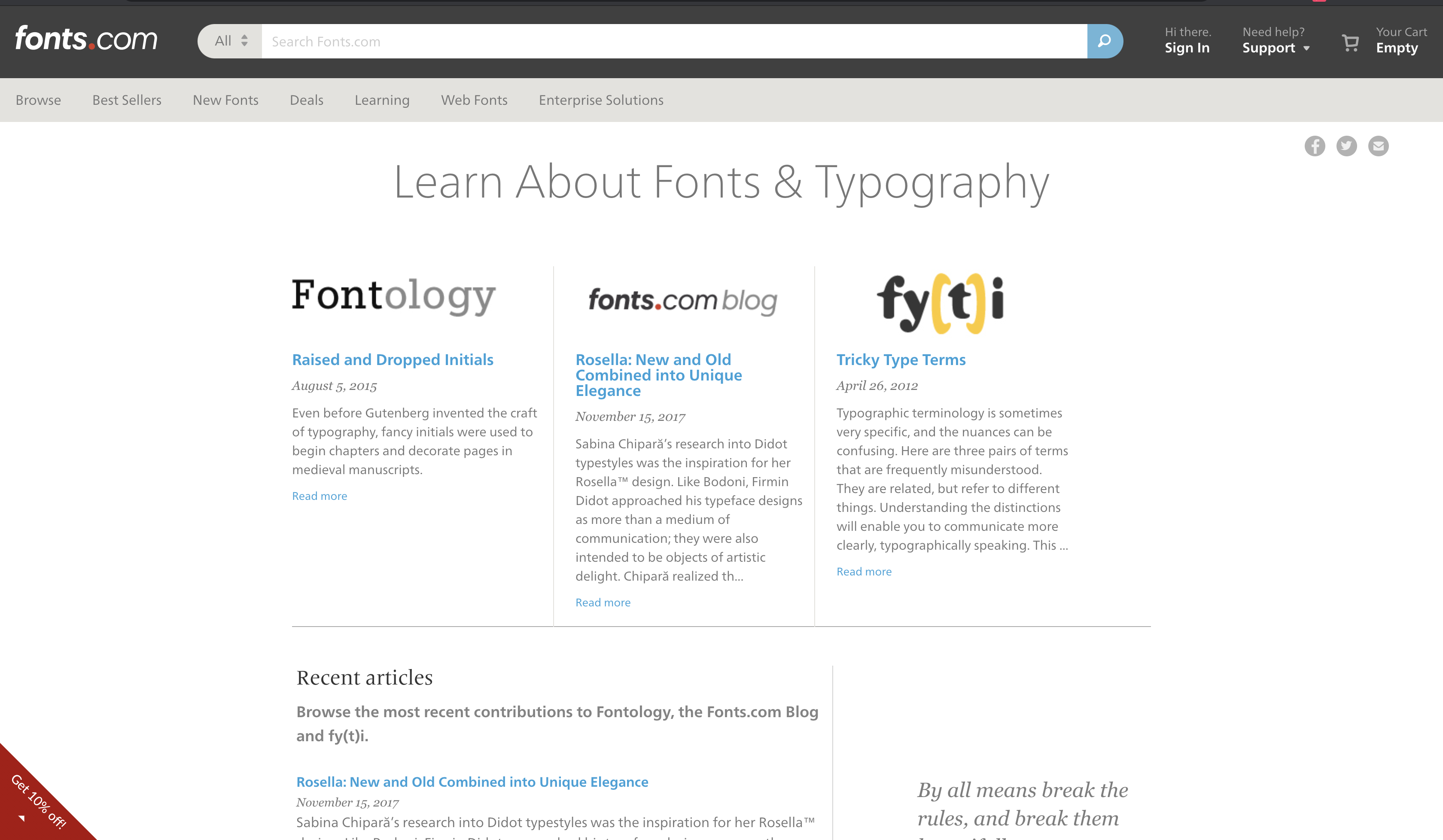 세계 최대 규모 폰트 제작사 Monotype 사에서 소유하고 있는 Fonts.com은 폰트를 구입할 수 있을 뿐 아니라, 타이포그래피의 거의 모든 것을 배울 수 있는 공간입니다. 검색창 하단에 위치한 Learning 카테고리를 클릭하면 영문 타이포그래피의 역사부터, 명칭, 기술적인 활용에 대한 방대한 자료들을 확인하실 수 있습니다.