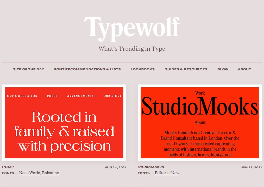 Jeremiah Shoaf라는 한 디자이너가 시작한 사이드 프로젝트인 Typewolf는 타이포그래피가 돋보이는 사이트들을 큐레이팅 하거나, 각종 타이포그래피 가이드와 리소스들을 제공하는 플랫폼입니다. Adobe Fonts, Google Fonts, Monotype 그리고 인디 폰트 제조사에서 제작한 폰트들을 기반으로 한 폰트 페어링 Lookbook 또한 판매하고 있으니 살펴보시면 좋을 거 같습니다.