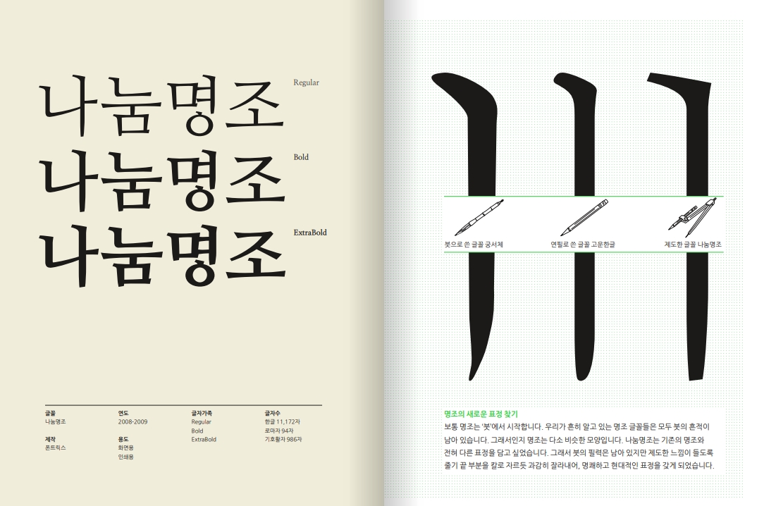 나눔명조는 기존 명조체를 계승 발전시켜 획의 단순화 과정을 거치고 현대적 미감에 맞게 제작한 새로운 명조체로 개발되었습니다.